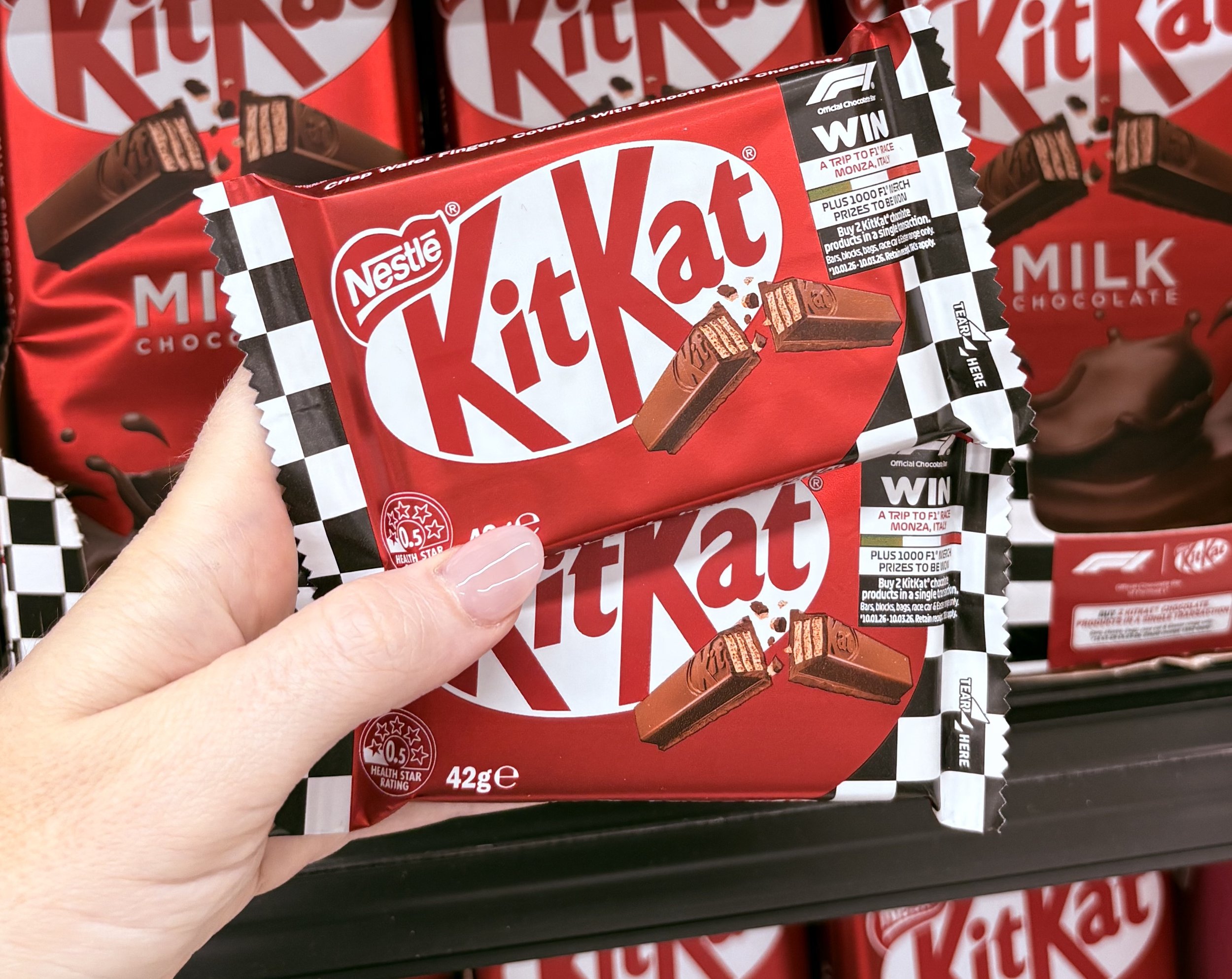 To enter, purchase any 2 KitKat chocolate products (bars, blocks, share bags, racing car, Easter range only) in a single transaction, retain your purchase receipt and enter at kitkat.com.au/f1.