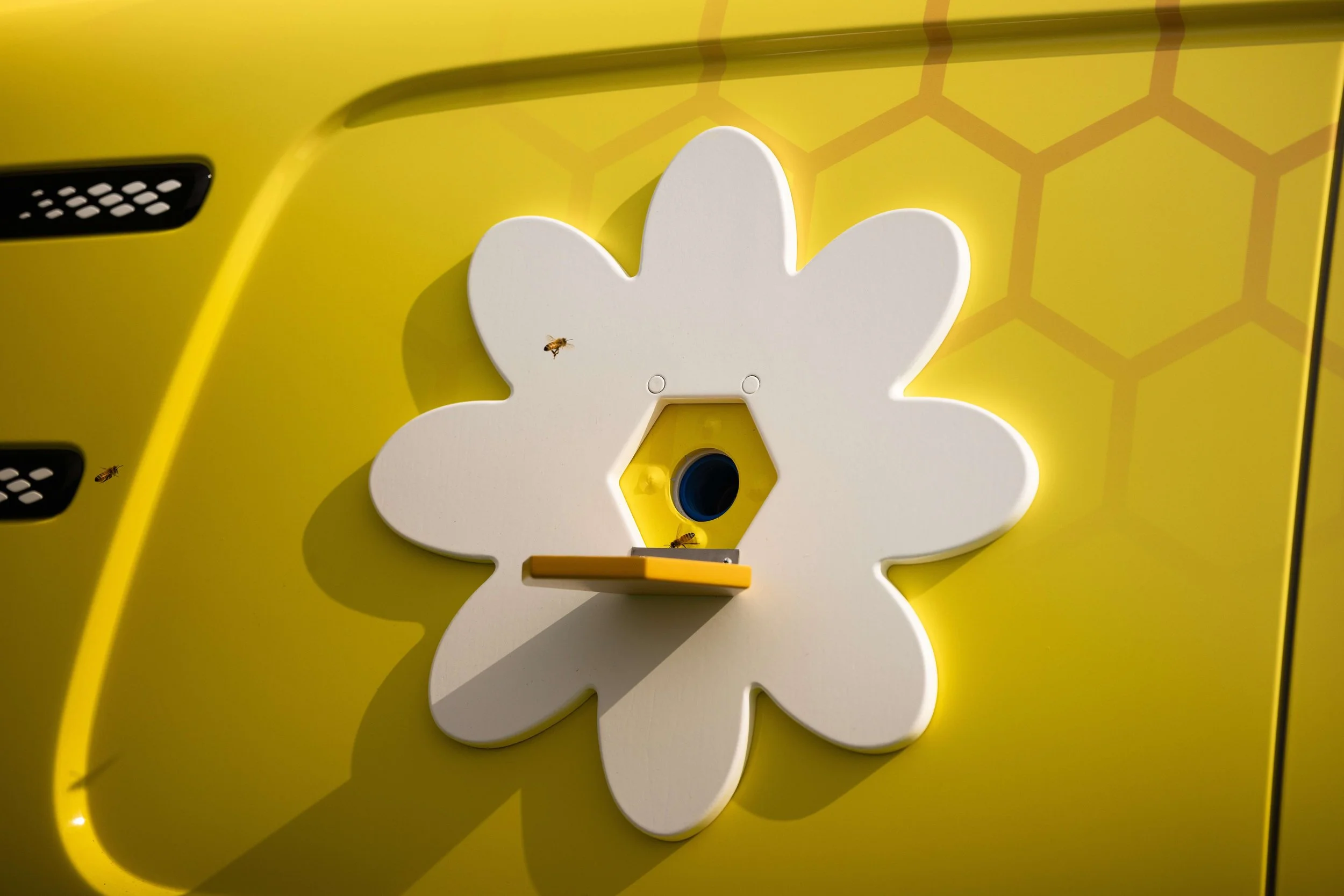 The van has been transformed into a hive-like environment and now houses active colonies with entry and exit tubes, allowing the bees to safely come and go as they please to pollinate.