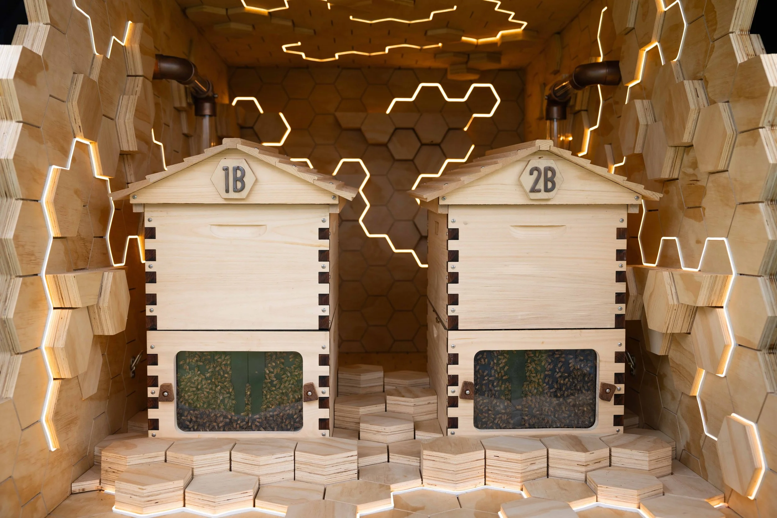 The interior is climate-controlled to replicate natural conditions and keep the bees comfortably cool, just as they would be in a standard hive.